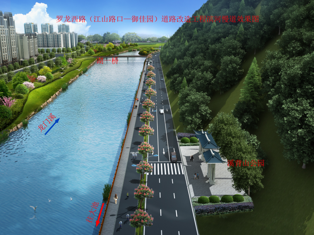 羅龍西路是連接龍巖西高速出入口與中心城市的唯一通道,其規(guī)劃改造范圍從紅竹山橋至御佳園路口,全長3855米,計劃將原道路拓寬至40米,實行雙向六車道,兩旁設(shè)2.5米非機動車道,并在湖二橋路口以東設(shè)640米入城單向三車道隧道連接至御佳園路口,原羅龍西路湖二橋至御佳園段將調(diào)整為出城單向車道。