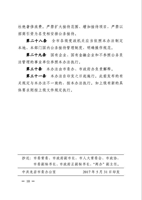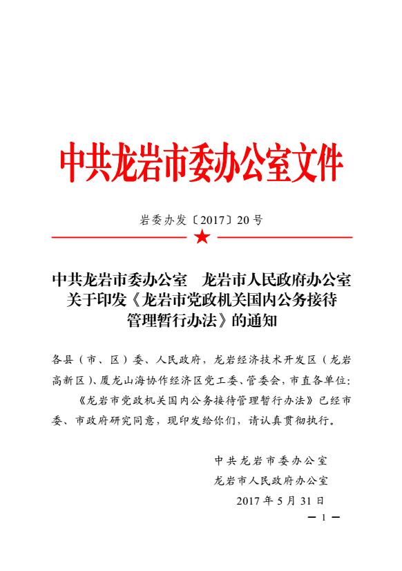 市委辦、市政府辦關(guān)于印發(fā)《龍巖市黨政機(jī)關(guān)國內(nèi)公務(wù)接待管理暫行辦法》的通知(巖委辦發(fā)【2017】20號(hào))