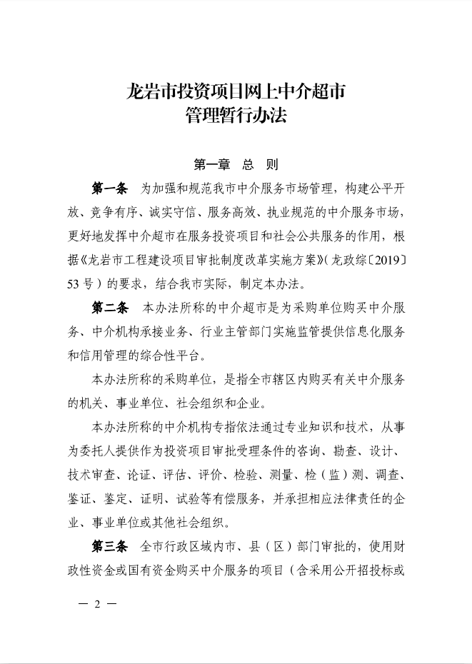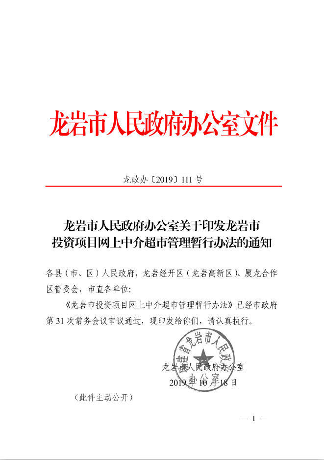龍巖市人民政府辦公室關于印發(fā)龍巖市投資項目網上中介超市管理暫行辦法的通知(龍政辦[2019]111號)
