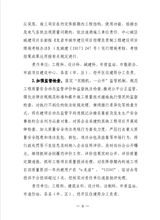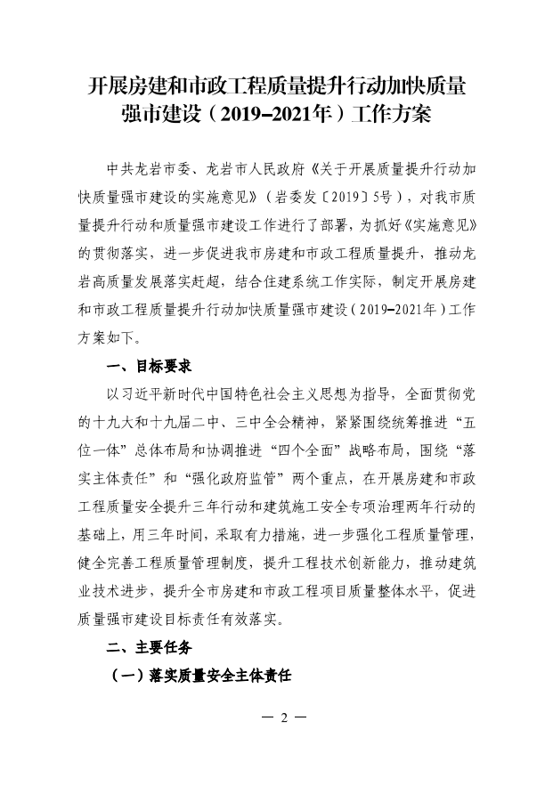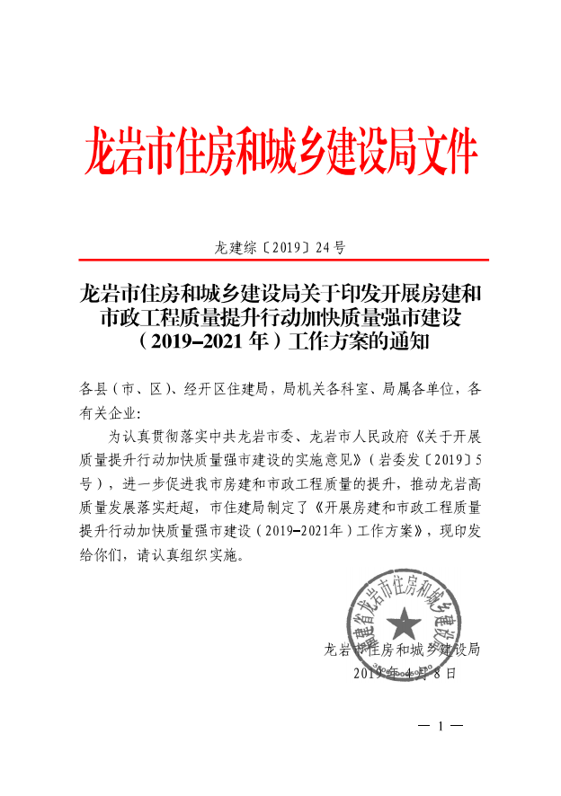 龍巖市住房和城鄉(xiāng)建設(shè)局關(guān)于印發(fā)開(kāi)展房建和市政工程質(zhì)量提升行動(dòng)加快質(zhì)量強(qiáng)市建設(shè)(2019-2021年)工作方案的通知
